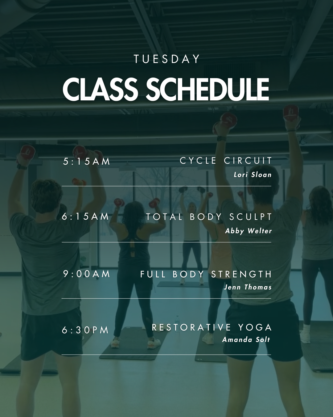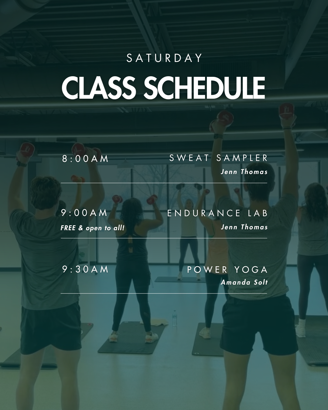 Join Jenn Thomas for Personal Training, and Monday-Saturday for HIIT Express, Bootcamp Express, Full Body Strength, Tabata Blast, Circuit Training, Power Hour, and Saturday Sweat Sampler.